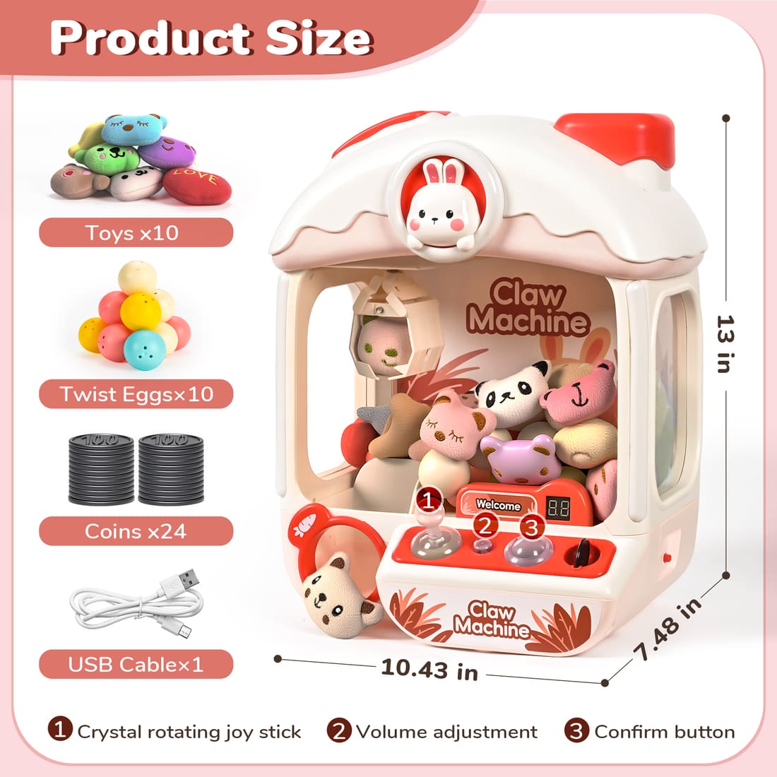 Includes 10 stuffed toys, 10 surprise eggs, and 24 coins. Add your own small treats for endless surprises! With dual power options (USB/batteries) and no assembly required, it's the perfect gift to spark joy and develop concentration for kids ages 3+.