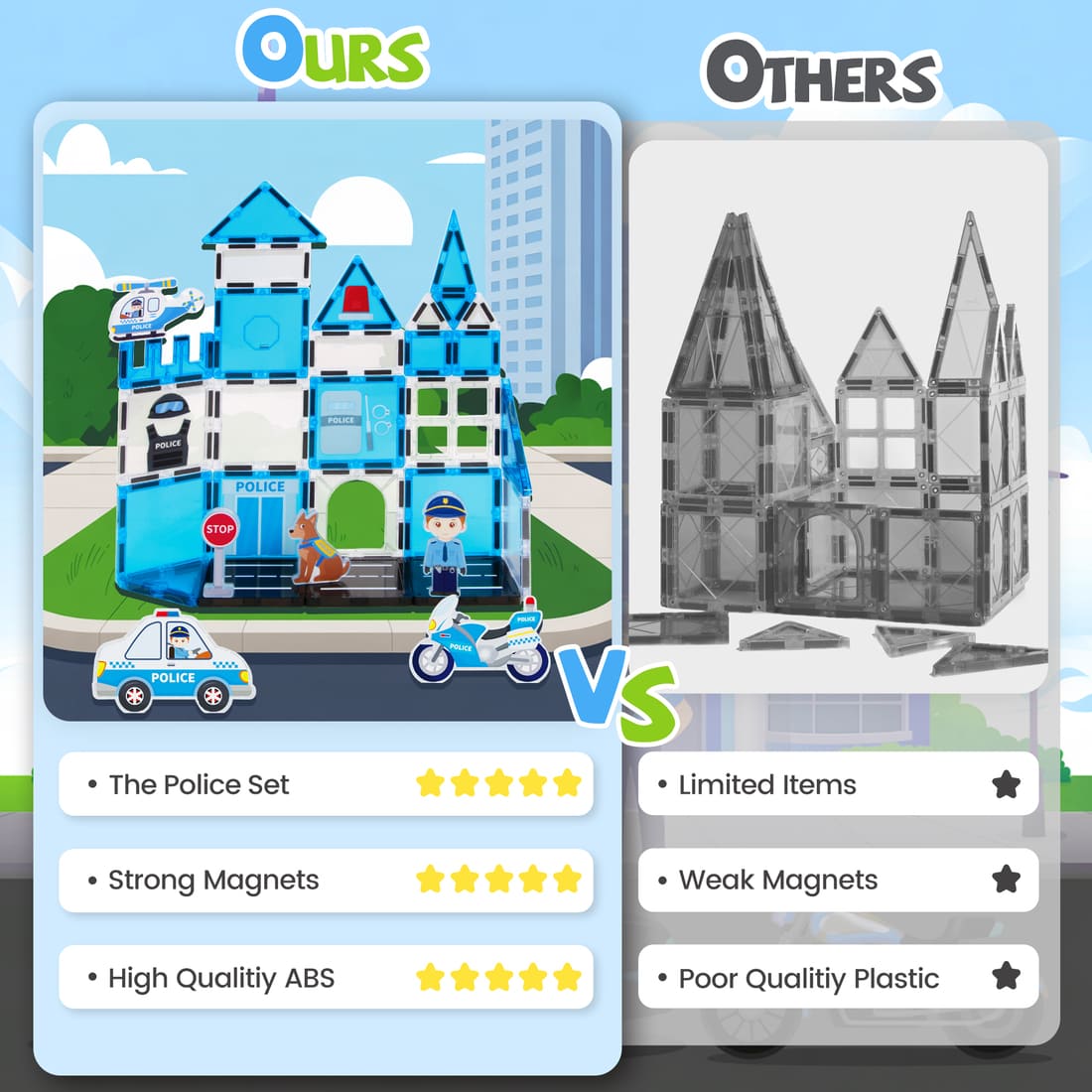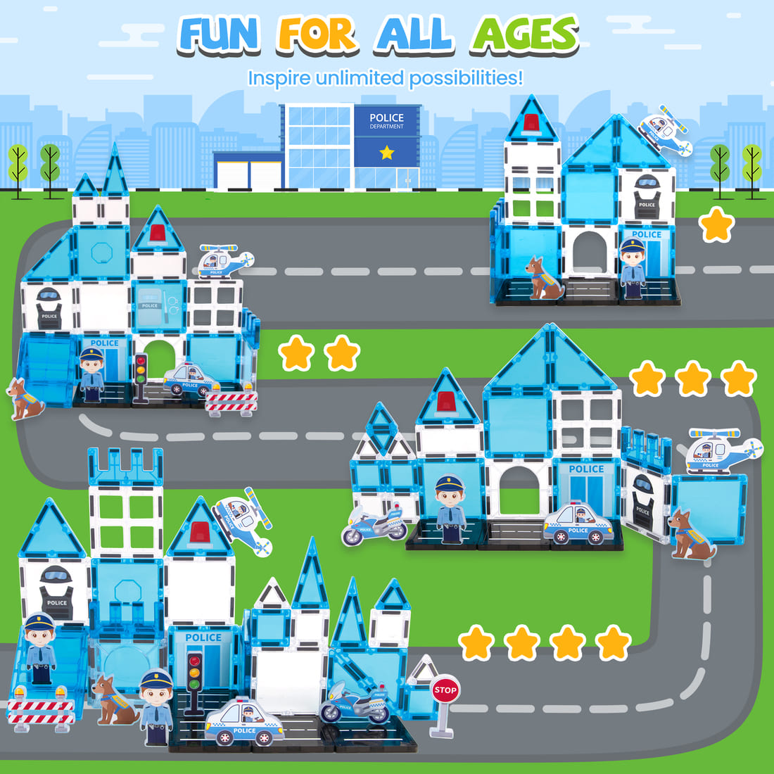 Build strong minds with safe hands-on play! Our police-themed magnetic tiles feature child-safe materials and securely sealed magnets for wobble-free construction. With realistic designs and figures that snap firmly into place, this set inspires imaginative role-play for unlimited creative possibilities.